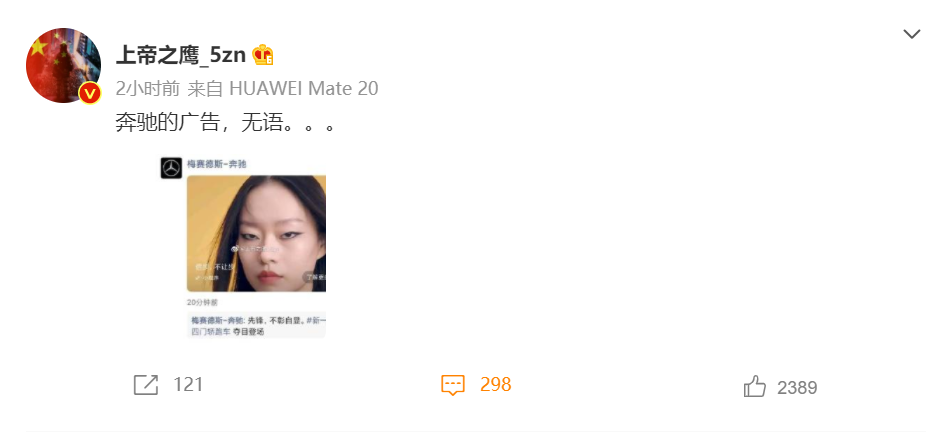 12月27日,@上帝之鷹_5zn放出奔馳梅賽德斯-奔馳推廣的廣告封面,並配文“奔馳的廣告,無語”。