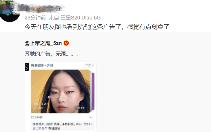 也有網友指責“這群人在PUA中國消費者”,還有網友說,在收到奔馳的這組“眯眯眼”廣告推送,並稱“感覺有點刻意了”。