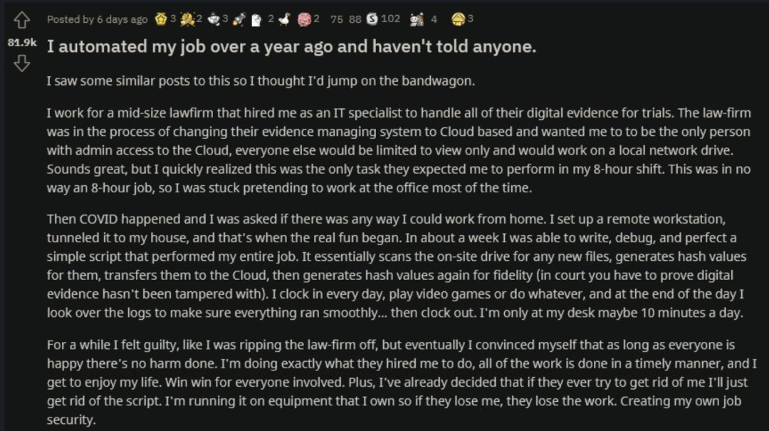 在这篇帖子中,该匿名楼主指出:“我意识到这是公司希望我在8小时的上班时间中完成的唯一任务,但这绝不是一份需要8小时的工作,所以我大部分时间都在办公室里假装工作。” 此外,他还表示用来摸鱼的脚本只是“几行代码”而已,通过把数千份文档和照片传输和验证到云端,并在下班前查看日志确保无误即可,但脚本让自己可以在一整天的时间里做其他更重要的任务,比如:打游戏。
