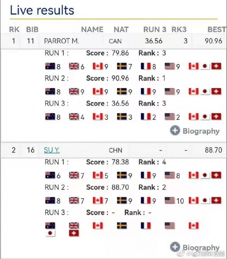 不是说非得小苏排第一才行,动作完成度,更别说决赛里面1620+1800,且目前唯一,至少给一个90+的分数,也就不说什么了。决赛里面,两个加拿大裁判,敢说没给小苏压分???