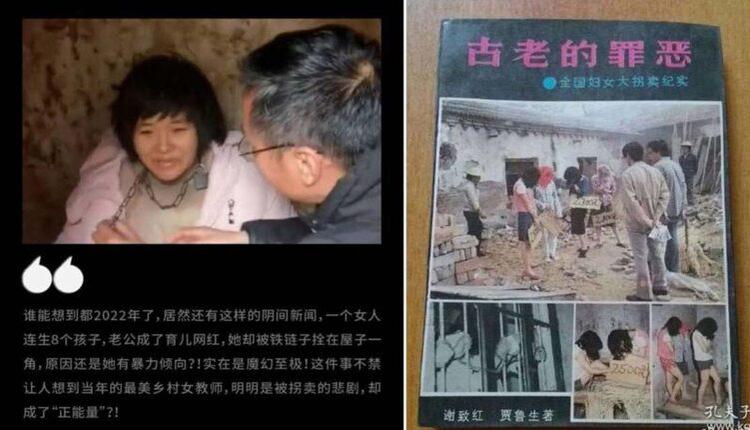 左圖:徐州豐縣被狗鏈拴著的8個孩子的母親;右圖:1989年出版的《古老的罪惡——全國婦女大拐賣紀實》。(圖片來源:微博)