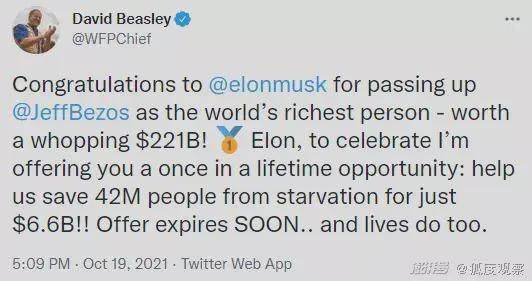 去年10月下旬左右,马斯克超越贝佐斯登顶世界首富,WFP执行干事戴维·比斯利就在推特上“逼捐”——“马斯克先生,为了庆祝这一成就,我为你提供了一个可以吹一辈子的慈善机会:用66亿美元来帮助4200万人免受饥饿之苦。”