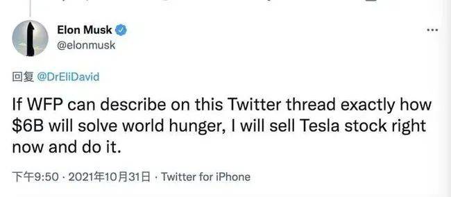 马斯克则表示,只要WFP能说清如何用60亿美元解决全世界饥饿问题,他就立即套现特斯拉股票捐出去。