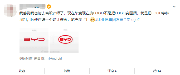 不过这在很多网友看来,比亚迪全新logo好像改了又好像没改。有网友直言,感觉我也能去当设计师了,现在毕竟现在换logo不是把logo变圆润,就是把logo字体加粗,顺便在编一个设计理念,这完美了。
