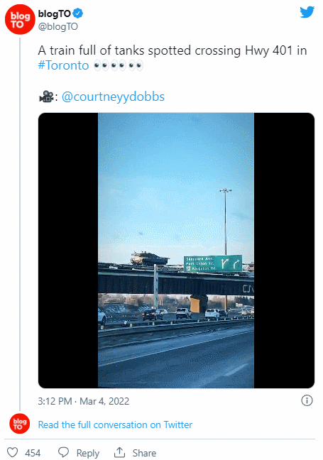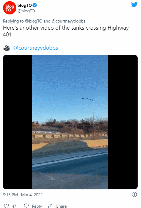 上述視頻的拍攝者Courtney Dobbs告訴BlogTO,她看到坦克的第壹反應是震驚。“這絕對不是你每天都能看到的。”