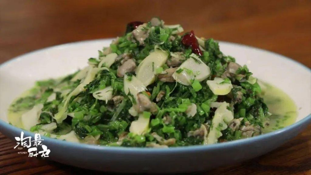 松江本地菜最讲究时令本味,李大厨将两种鲜美食材和蚬子搭配在一起,制作了这道 雪里蕻春笋炒蚬子肉。