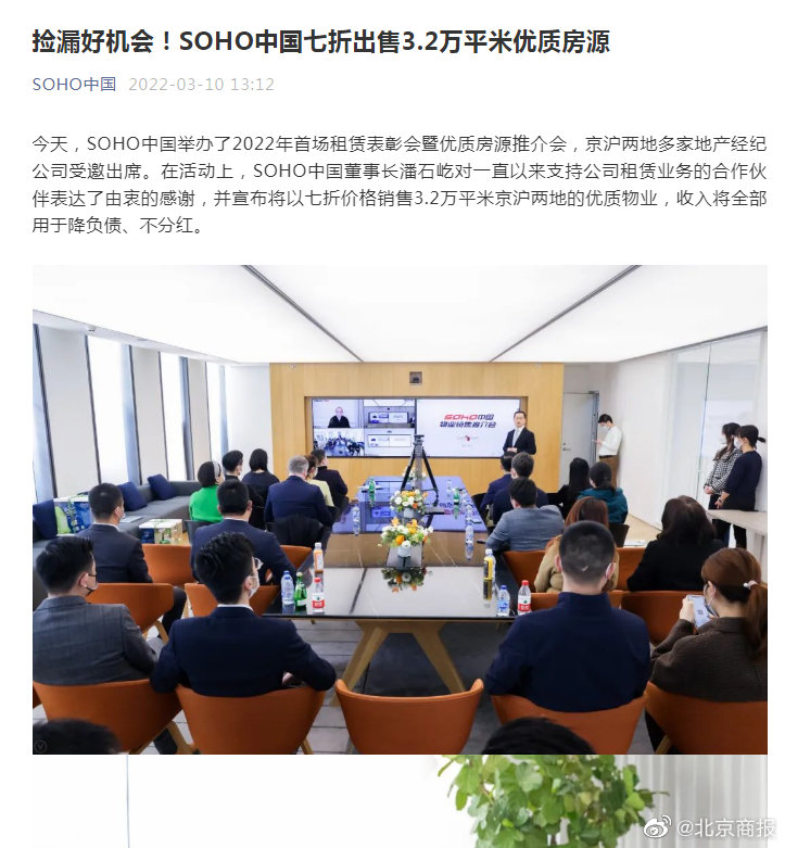【#SOHO中國柒折出售3.2萬平京滬房源# 網友:發我個購買鏈接[吐舌]】3月10日,據SOHO中國官方微信公眾號披露信息,在當日舉辦的2022年首場租賃表彰會暨優質房源推介會上,SOHO中國董事長潘石屹宣布將以柒折價格銷售3.2萬平米京滬兩地的優質物業。
