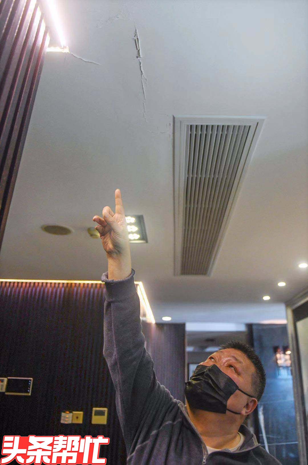 新民晚报“新民帮侬忙”记者看到,靠近客厅、厨房、玄关处的天花板上有长短、大小不一的裂痕,总共有近10条。陈先生女儿的房间墙壁鼓起,无法平整对齐。