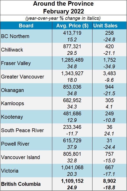 從 MLS 系統的平均售出房價來看,BC 省 2 月的平均房價達到 $1,109,152,相比去年 2 月同期房價($887,866)上漲了 24.9%。