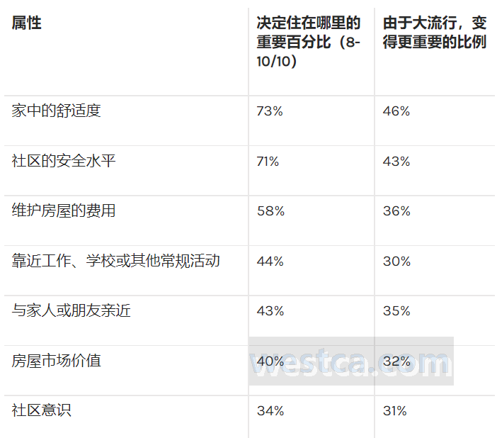 加拿大人向來看重家中的舒適程度和社區的安全性,在疫情前,在決定居住地點時,73%的人看重家中的舒適度,71%的人看重社區內的安全水平,此外超過58%的人認為維護房屋的成本是最重要的因素。