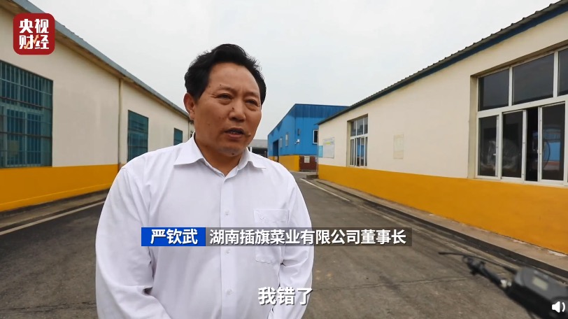 “我錯了,深感慚愧,向廣大消費者道歉。在今後接受檢查,整改到位。”3月16日,315晚會上被曝光用“土坑酸菜”的湖南插旗菜業董事長嚴欽武面對鏡頭,向消費者道歉。