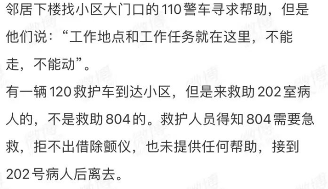 在他们走后半小时,另一辆救护车才赶到现场,但因为贻误时机,804业主抢救无效死亡。