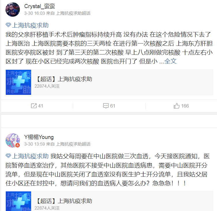 老徐我看到一份上海抗疫求助的动态话题,里面有不少病人需要血透和需要药物的求助信息。