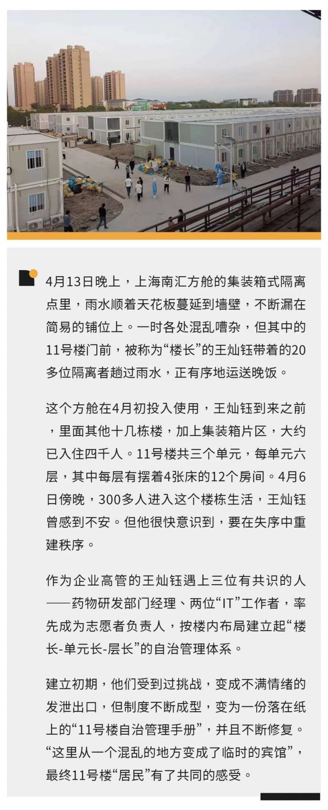 來夢龍是南匯方艙11號樓的志願者負責人,更具體的“頭銜”是——壹單元“樓組長”。單元裡住了138個人,人員構成復雜,他估算老人和孩子起碼有壹百人,有孩子僅兩個月大的寶媽,也有90歲的老人。他特意選擇住在2樓,這樣上下樓方便。