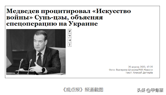 在4月20日的視頻講話中,俄羅斯安全委員會副主席梅德韋傑夫援引《孫子兵法》中的名句解釋俄羅斯在烏“特別軍事行動”的實質。引的是“故用兵之法,無恃其不來,恃吾有以待也;無恃其不攻,恃吾有所不可攻也。”