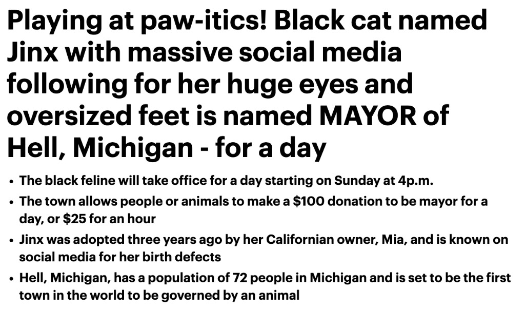 (加西网综合)一只长着大眼睛和大脚的网红黑猫将创造历史,成为密歇根小镇 - Hell 的第一位动物镇长。