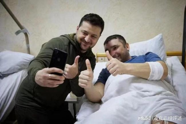 而总统泽连竟然不顾总统之尊,丝毫没有总统的架子,双腿微微弯曲,亲密地靠向士兵,他努力控制着身体以使得自己跟卧床的伤员士兵一样高。与伤员一样,他的脸上也洋溢着快乐的笑,他同样也伸出了大拇指。