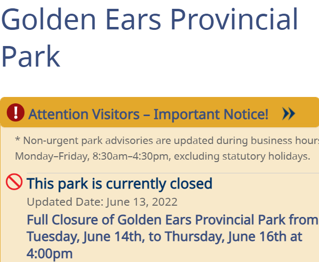BC公園局昨天在通知中表示,占地 62,500 公頃的 Golden Ears 公園將於周贰、周叁和周肆的大部分時間完全關閉。過去幾周內,公園局和保育官員壹直在合作,處理壹只有問題的黑熊。