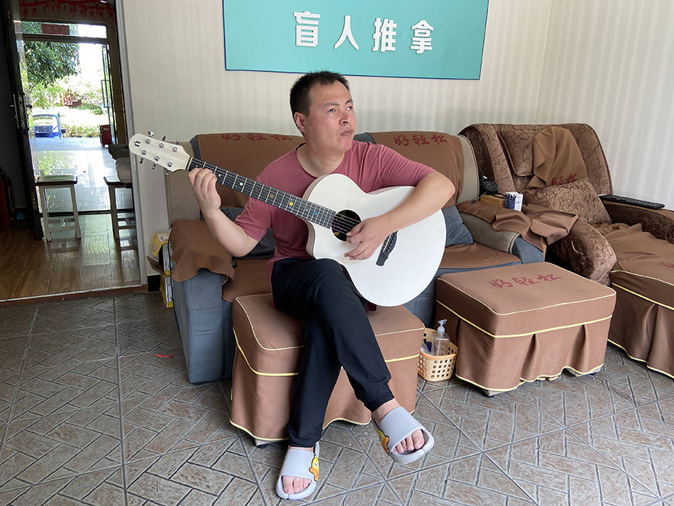 為了打發時間,盲人按摩師任鳳來在店裡練習吉他。