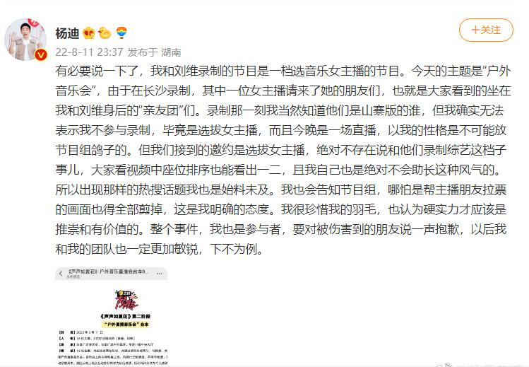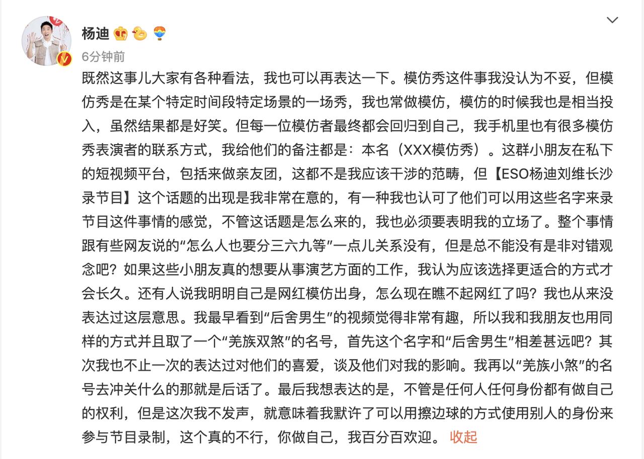 8月12日,杨迪再发声回应与“ESO”录综艺一事:“不管是任何人任何身份都有做自己的权利,但是这次我不发声,就意味着我默许了可以用擦边球的方式使用别人的身份来参与节目录制,这个真的不行,你做自己,我百分百欢迎。” 此前,杨迪、刘维、ESO长沙录制综艺引发热议,杨迪随后发文称和刘维录制的节目是一档选音乐女主播的节目,其中一位女主播请来了她的朋友们(即ESO),自己要对被伤害的朋友说一声抱歉。