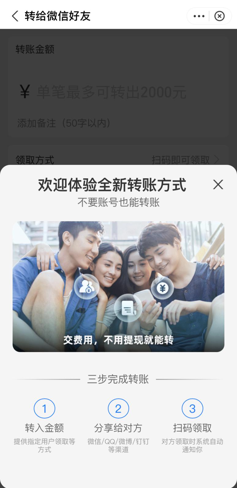 根據支付寶介紹,全新的轉賬方式無需賬號也能實現轉賬,只要支付寶用戶完成叁個步驟即可。用支付寶向微信用戶轉賬,單筆最高可以轉出 2000 元。