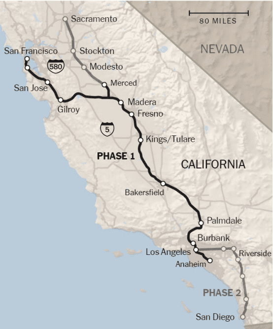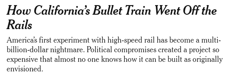 原本預計連接舊金山和洛杉磯兩座城市的高鐵,於2008年首次獲得批准修建,最初預估耗資330億美元,而隨著動工,未來預估將耗資將達到1130億美元。