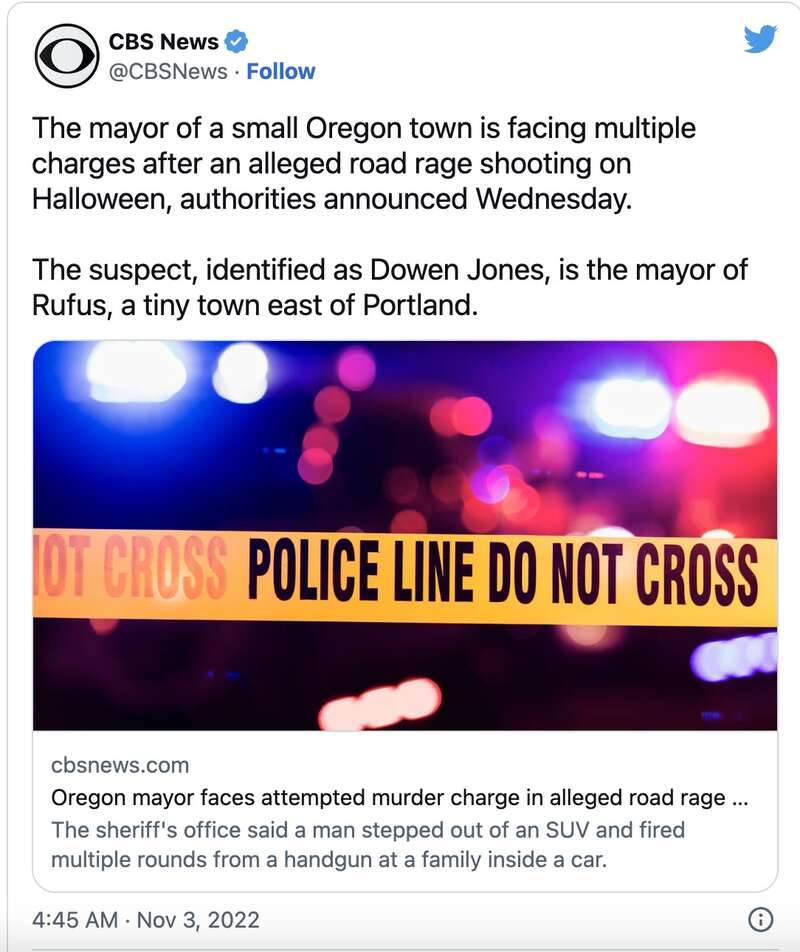 美联社报导,俄勒冈州胡德河郡(Hood River County)警局表示,鲁福斯市(Rufus)市长琼斯(Dowen Jones)在帕克代尔(Parkdale)附近用手枪朝一台行经车辆连开数枪。