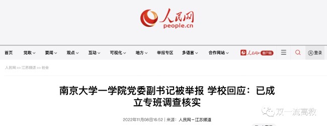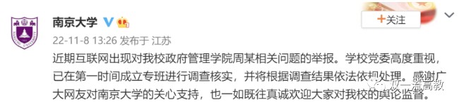 據@南京大學 11月8日消息:近期互聯網出現對我校政府管理學院周某相關問題的舉報。學校黨委高度重視,已在第壹時間成立專班進行調查核實,並將根據調查結果依法依規處理。感謝廣大網友對南京大學的關心支持,也壹如既往真誠歡迎大家對我校的輿論監督。