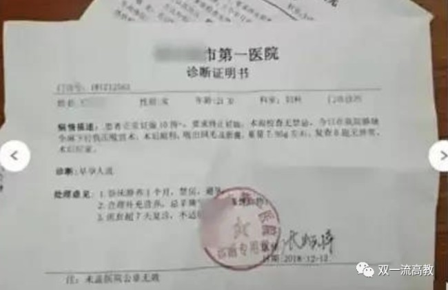 舉報材料顯示,舉報人王某某為南京大學政府管理學院畢業生,2018年在學校讀書時,被周恒性侵犯並懷孕流產。舉報材料中壹張2018年12月12日醫院出具的診斷證明書顯示,王某某被診斷為早孕人流,病情描述稱患者正常妊娠10周,要求終止妊娠。