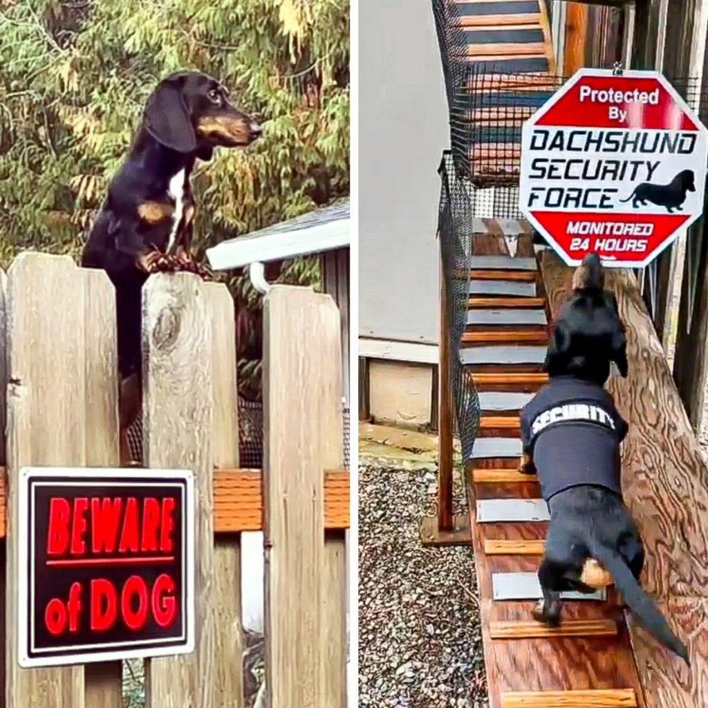 這只小臘腸犬身型雖小,卻有當哨衛兵的雄心壯志,主人完成了它的願望。