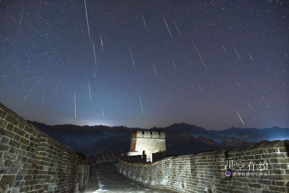 中國天文學會會員、天津市天文學會理事楊婧2021年12月14日在天津市薊州區黃崖關長城拍攝的雙子座流星雨(多張疊加)。(本人供圖)