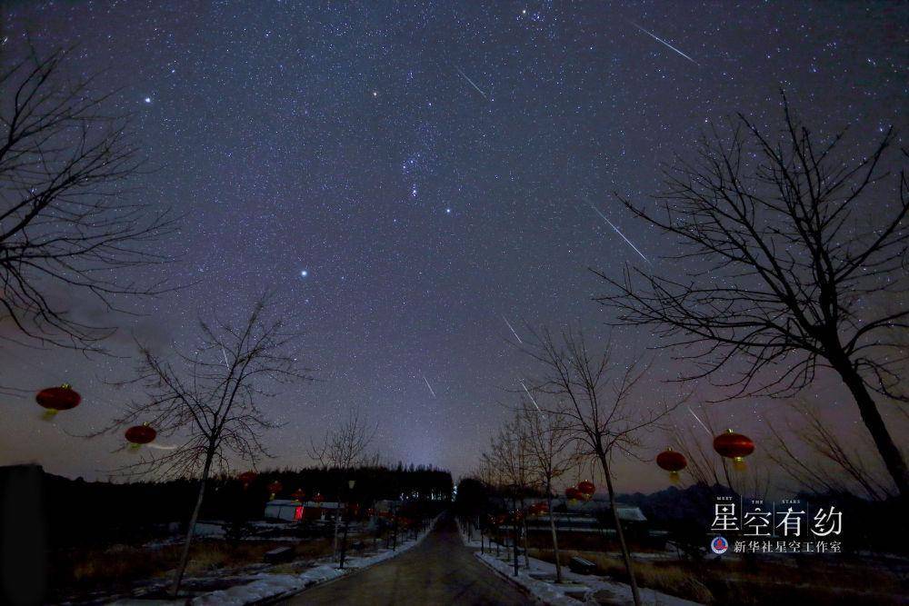 北京市海澱區中關村第贰小學天文教師朱戈雅2015年12月14日在北京房山花台風景區拍攝的雙子座流星雨(多張疊加)。(本人供圖)