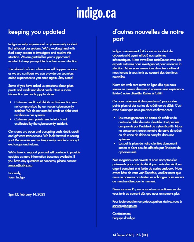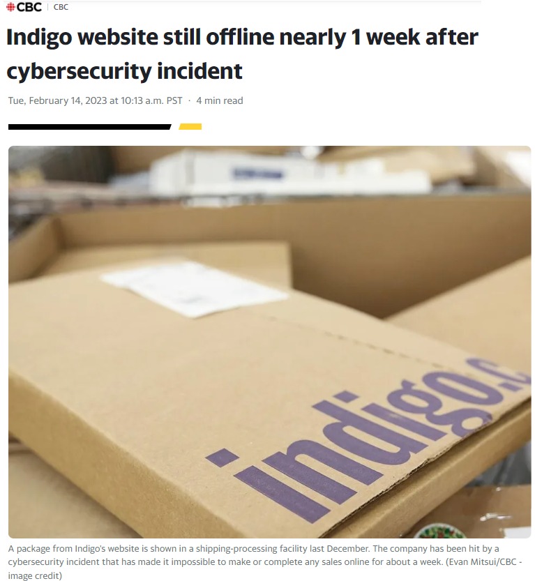 Indigo是在多倫多股票交易所(TSX)上市的書商,官網在2月8日周叁遭到黑客攻擊,導致全公司范圍內網站無法使用,導致實體店內無法處理任何非現金交易,任何想退貨,以及想使用銀行卡、信用卡或禮品卡購買商品的客戶帶來不便。