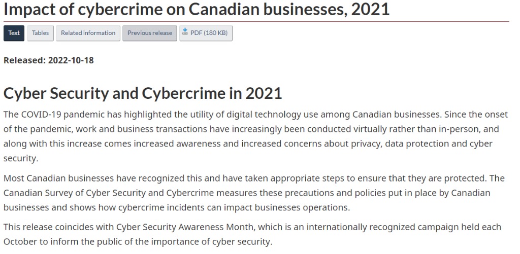 加拿大統計局(Statistics Canada)表示,勒索軟件攻擊占2021年所有網絡安全事件的11%,這是最近壹年獲得的最新數據。
