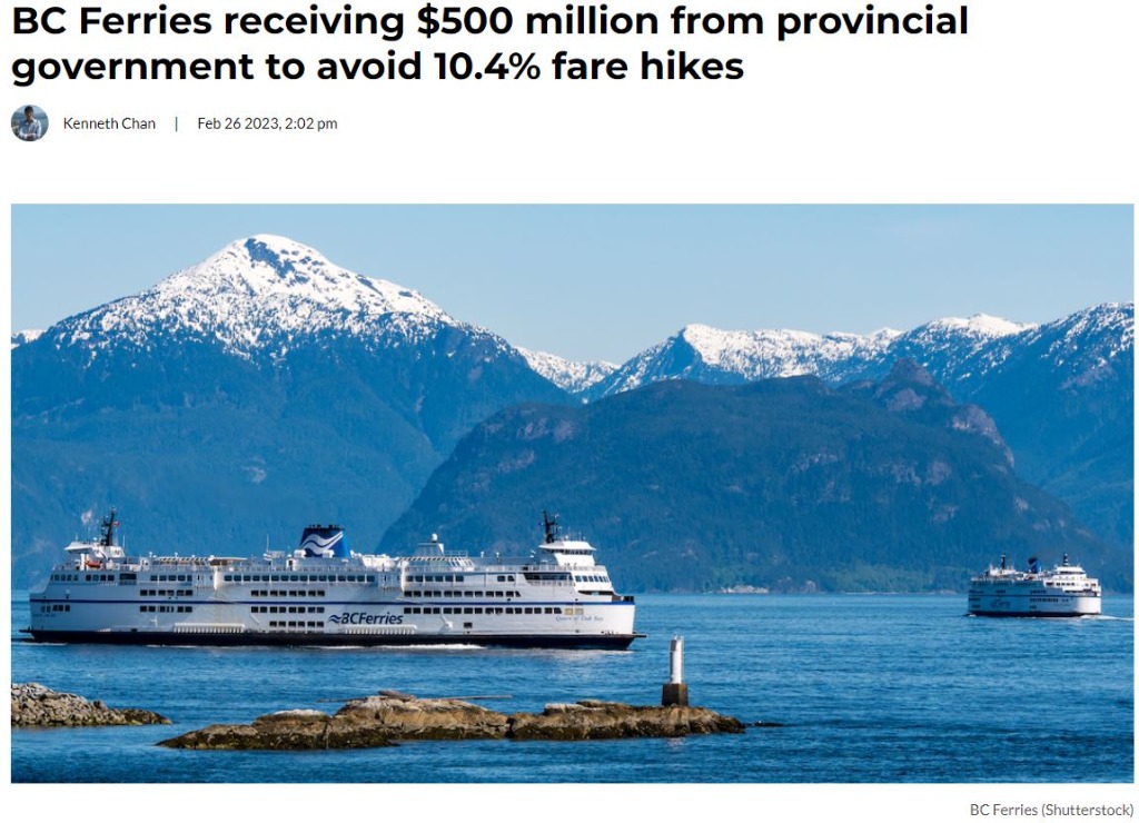 (加西网综合)BC省府将为BC渡轮公司(BC Ferries)拨款5亿加元,以避免新一轮10.4%的票价上涨。