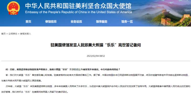 根據《中國動物保護協會》官網發布信息,中方赴美大熊貓專家組抵達孟菲斯動物園後,與美方專家共同完成了對大熊貓“樂樂”的屍體解剖檢查,解剖排除了導致動物意外死亡的如腸扭轉、主動脈破裂、肝膿腫破裂或大出血等常見病因。