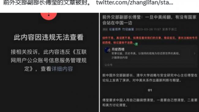 前外交部副部長傅瑩的文章被封。 https://t.co/nVooCGB8Id pic.twitter.com/qWM6WXp1PQ— 蔡霞 (@realcaixia) March 27, 2023