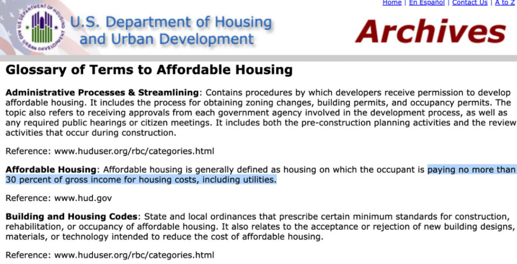 而美國住房和城市發展部把“可負擔房屋”定義為“占總收入30%及以下的住房成本,包括水電費”。