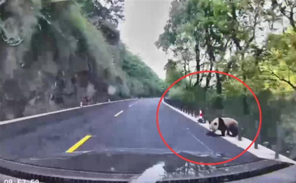 市民開車上班路上偶遇的大熊貓 視頻截圖