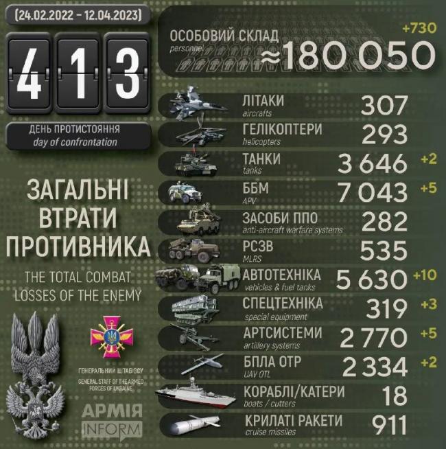 截止4月12日,乌克兰方面统计的俄军损失数字