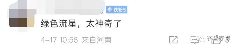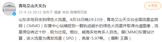當晚,青島艾山天文台發文證實,全國流星監測網(CMMO)東營中心站捕捉到壹顆軌跡超長的綠色火流星並取得光譜圖像,流星滯空將近拾秒,極為壯觀。
