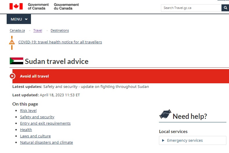 加拿大政府再於周日已經發布前往蘇丹的旅行警告,建議加拿大人避免前往蘇丹,並建議在當地的加拿大人在原地避難。