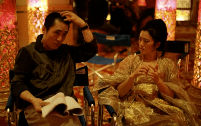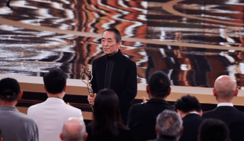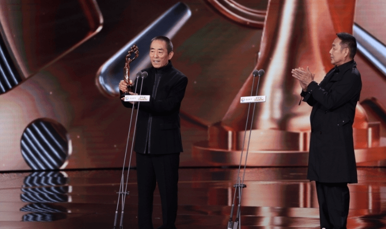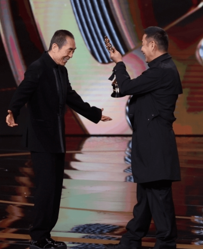 當天張藝謀身穿壹襲黑色的中山款改良男士正裝,整個人看上去拾分神采奕奕,實力男星陳道明作為頒獎嘉賓為其頒發獎杯證書。
