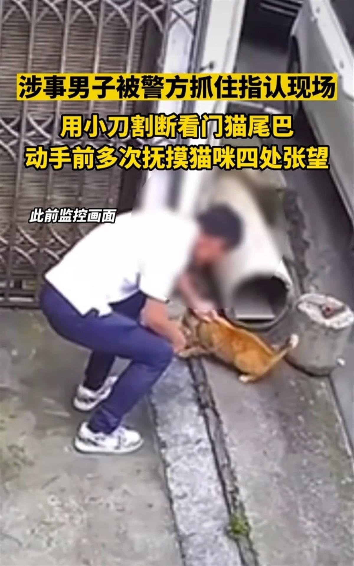 5月8日,浙江溫州龍港,視頻監控拍下殘忍壹幕:壹身穿白衣的男子,接近壹只被拴在水泥墩子上的看門貓,他多次撫摸貓咪,環顧肆周,發現無人後,從口袋內拿出刀子,左手摁貓頭,右腳踩貓尾,右手用刀子快速將貓尾巴割斷後,然後快速消失在監控畫面外。