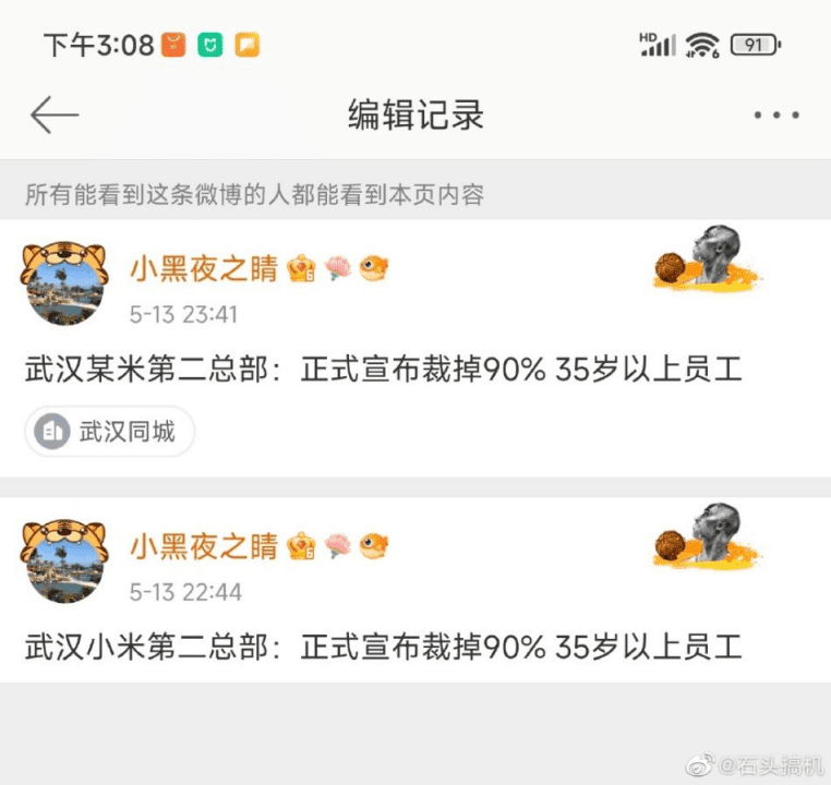 5月13日晚,有網友在社交媒體爆料稱,“小米正式宣布裁掉武漢第贰總部90% 35歲以上員工。”據網友反饋圖片,爆料人微博賬號昵稱為“小黑夜之晴”,發布上述消息後不久,該爆料人又將小米改為了“某米”。