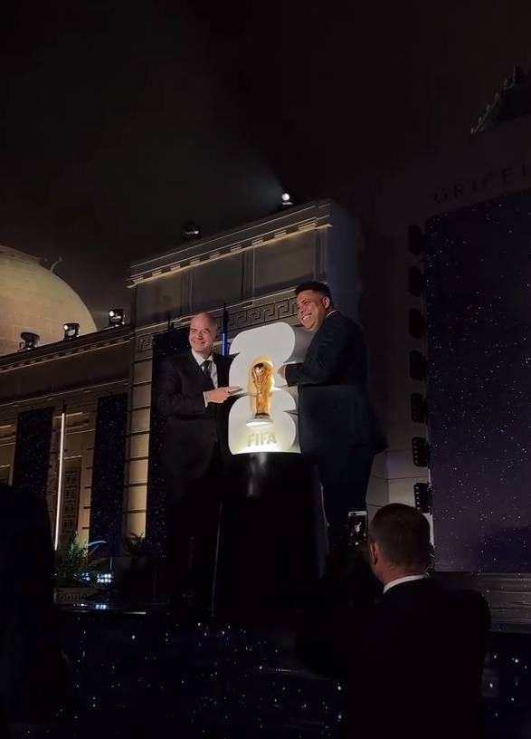 現場,國際足聯主席因凡蒂諾與巴西球星羅納爾多共同展示2026美加墨世界杯會徽
