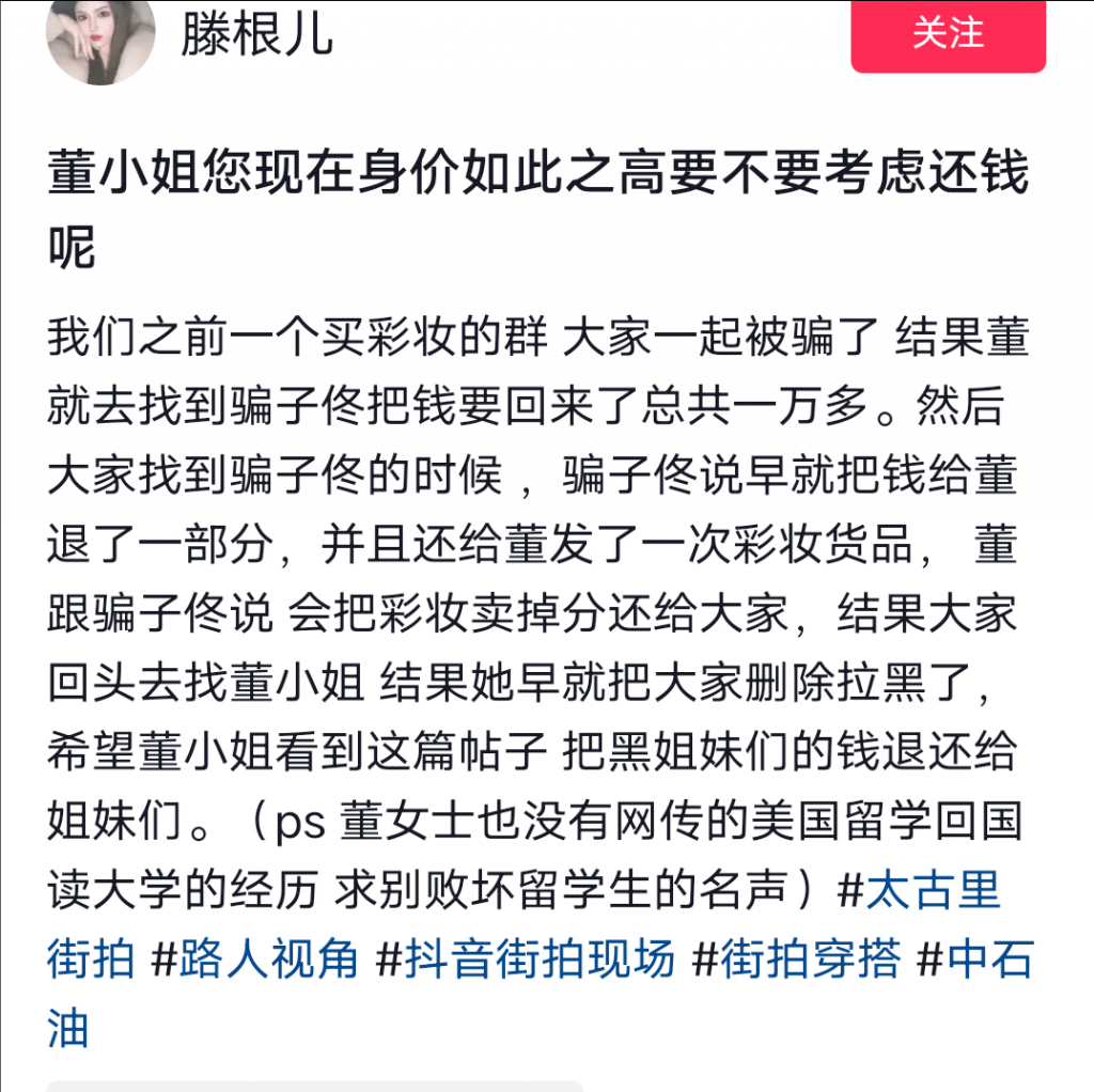 董思槿與領導的牽手視頻在網絡上廣為流傳,許多熟人也看到了這個視頻。有壹位自稱被董思槿騙過的網友曝光了她的騙局。