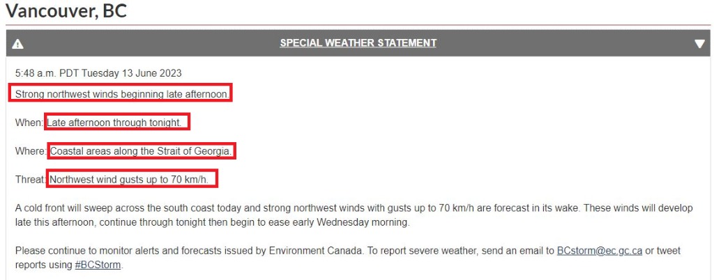 據DailyHive報道,加拿大環境與氣候變化部(Environment and Climate Change Canada)針對BC省南部沿海地區包括溫哥華發布特別天氣聲明,預計本地區將會出現強風天氣。