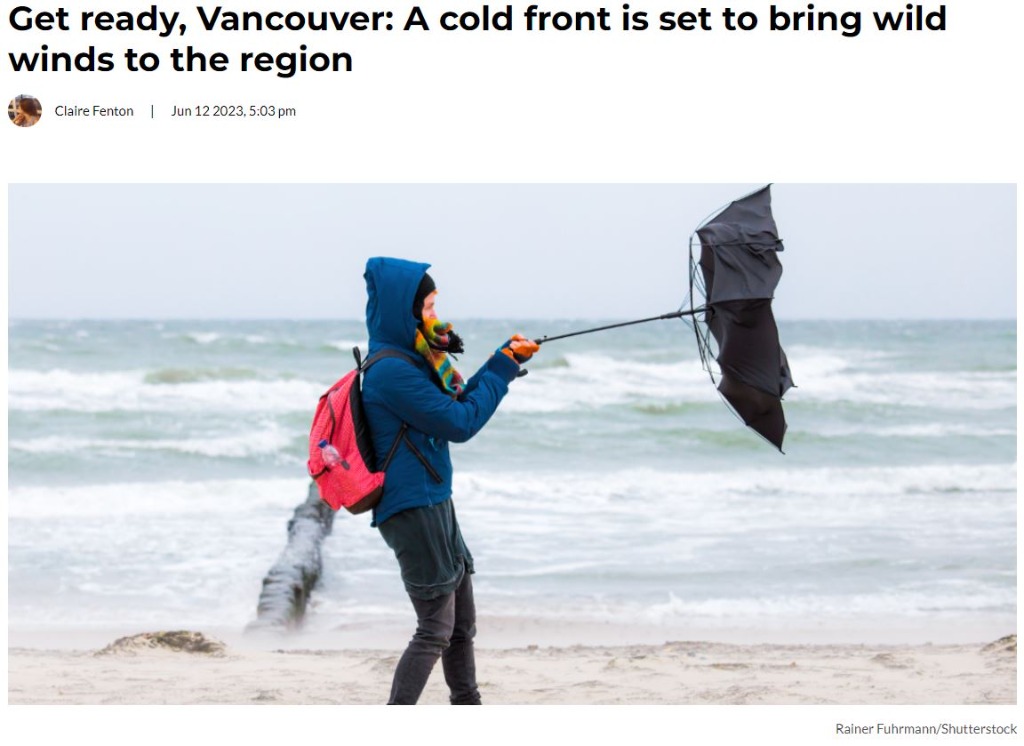 根據加拿大環境和氣候變化部周壹(6月12日)的聲明,預計風速可能會達到每小時70公裡,這種強風可能會導致停電和渡輪航班取消。