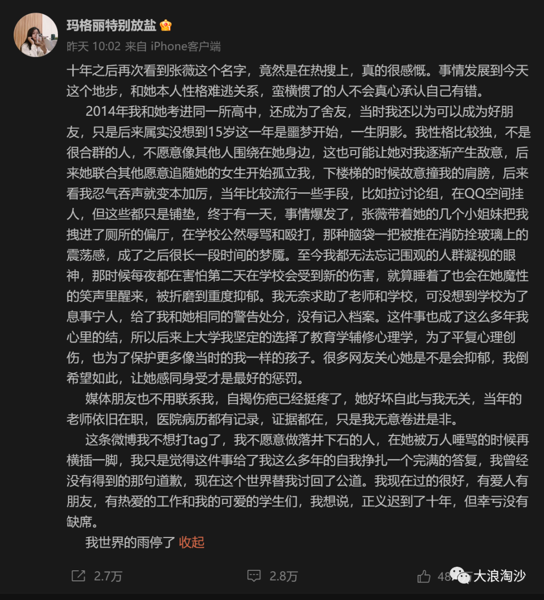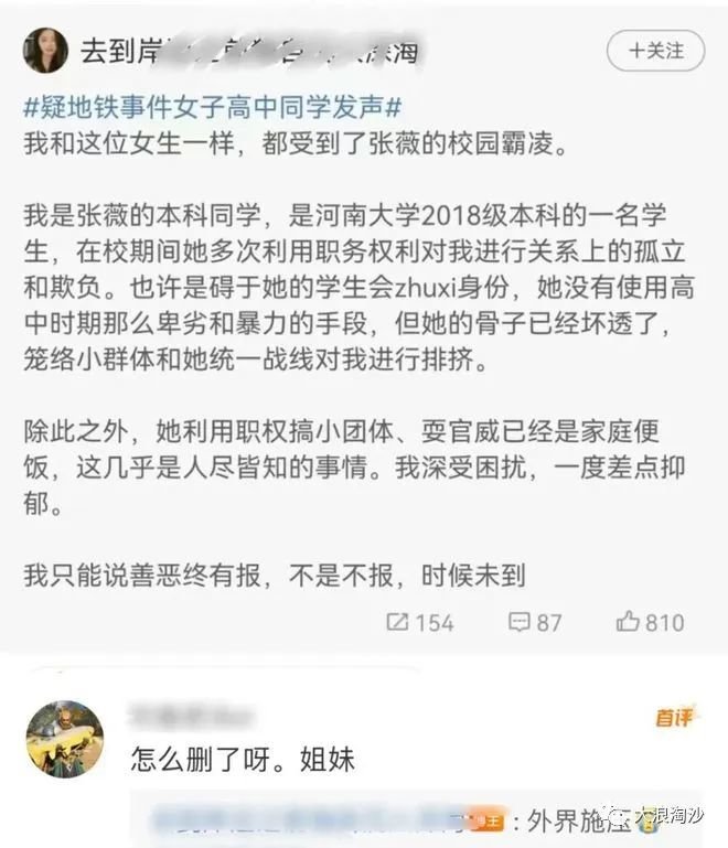 這件事情我壹直在寫著,但無奈各種信息更新太快,比如昨天剛剛爆出來,張薇早年是校園霸凌作惡者,受害者當時幾乎自殺,多年才走出來: